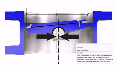 第三道偏心,密封面回轉軸線與閥體通道軸線偏心